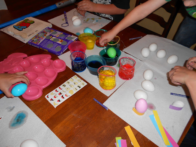 We had a great Easter. On Saturday morning we went to our ward Easter egg hunt. The kids ate donuts, hunted for eggs, and then played some egg games. They had great fun. Saturday night the kids and I colored eggs for the Easter Bunny to hide. The kids went to bed with dreams of sugar for the coming morning. Bear woke me up first on Easter morning. Early, soooo early! We have church a 8:00am. I told the kids that they could go look downstairs but not touch. They found all of their baskets though and came up to tell me all about them. We went to church and had a great church day. I told the kids on our way home that we were going to have our special Easter family home evening as soon as we got home. They sat on the couch still in their church clothes and we remembered the true meaning of Easter. We watched a couple of mormon messages and my kids explained to me the reason for Easter. Gracie's eyes swelled with tears and she told me about how much our Savior loves us. Savannah explained Easter and it's meaning with a tender heart. Even my squirelly little boys understand showed reverence for the special day. My heart was content and full. I am grateful. I really like this video. Then my kiddos changed their clothes and ate a lot of candy!!!!! Bliss. We cooked some traditional Easter food and had our family over for dinner. Happy Easter!